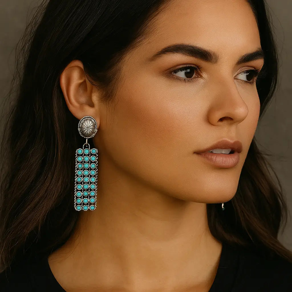 Elevate your look with these striking Zuni-style earrings, crafted with meticulous attention to Southwestern design. Featuring imitation turquoise stones arranged in a bold pattern, each earring evokes the intricate inlay work traditional to Zuni artisans. The faux stones offer the rich, earthy hue of genuine turquoise without the weight or price, making them perfect for everyday wear or special occasions. Finished with lightweight silver-tone metal alloy and a secure hook closure, these earrings bring timeless desert beauty to your jewelry collection — no authenticity certificate required, just pure style.