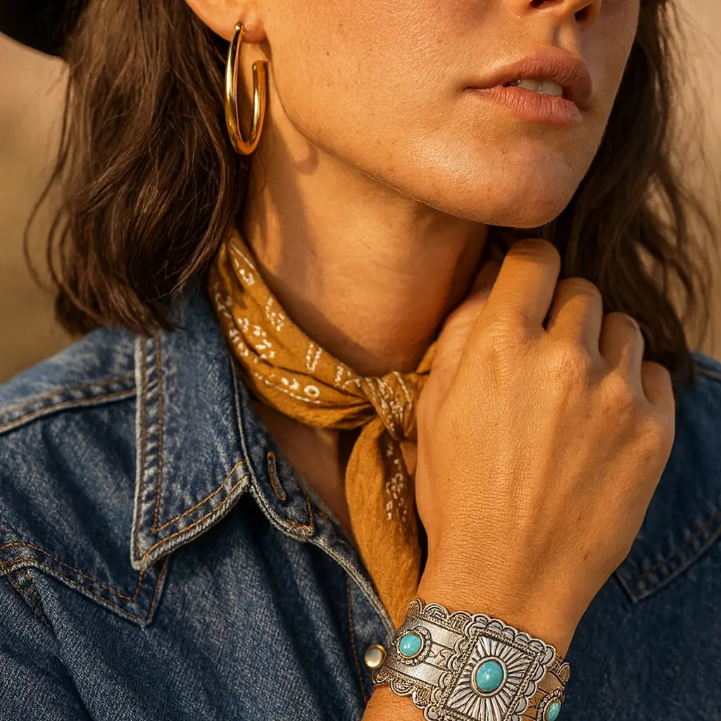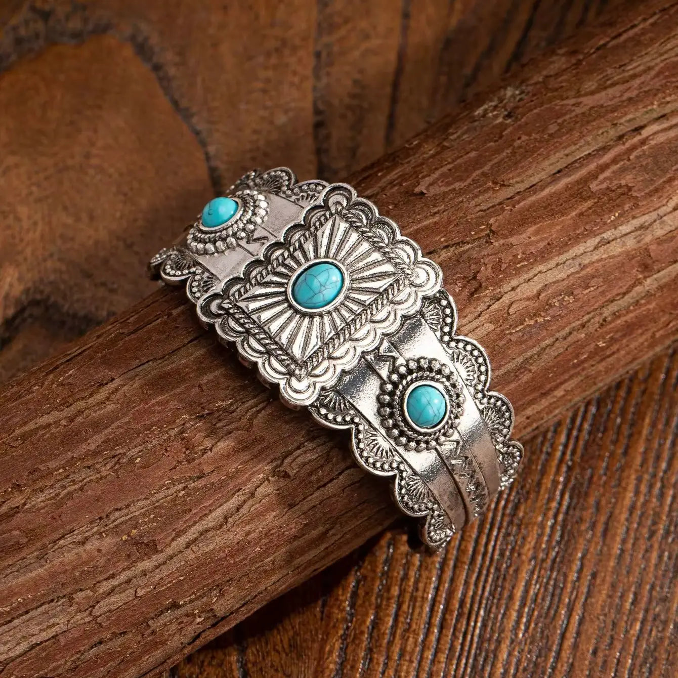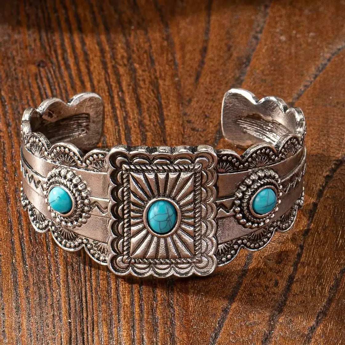 Capture the spirit of the West with this stunning cuff bracelet, designed to bring timeless western charm to your style. Crafted from silver-tone metal, it features intricate tooled detailing reminiscent of traditional western silversmithing. It is adorned with imitation turquoise cabochons, each stone highlighted by scalloped edges and engraved patterns that add depth and character.