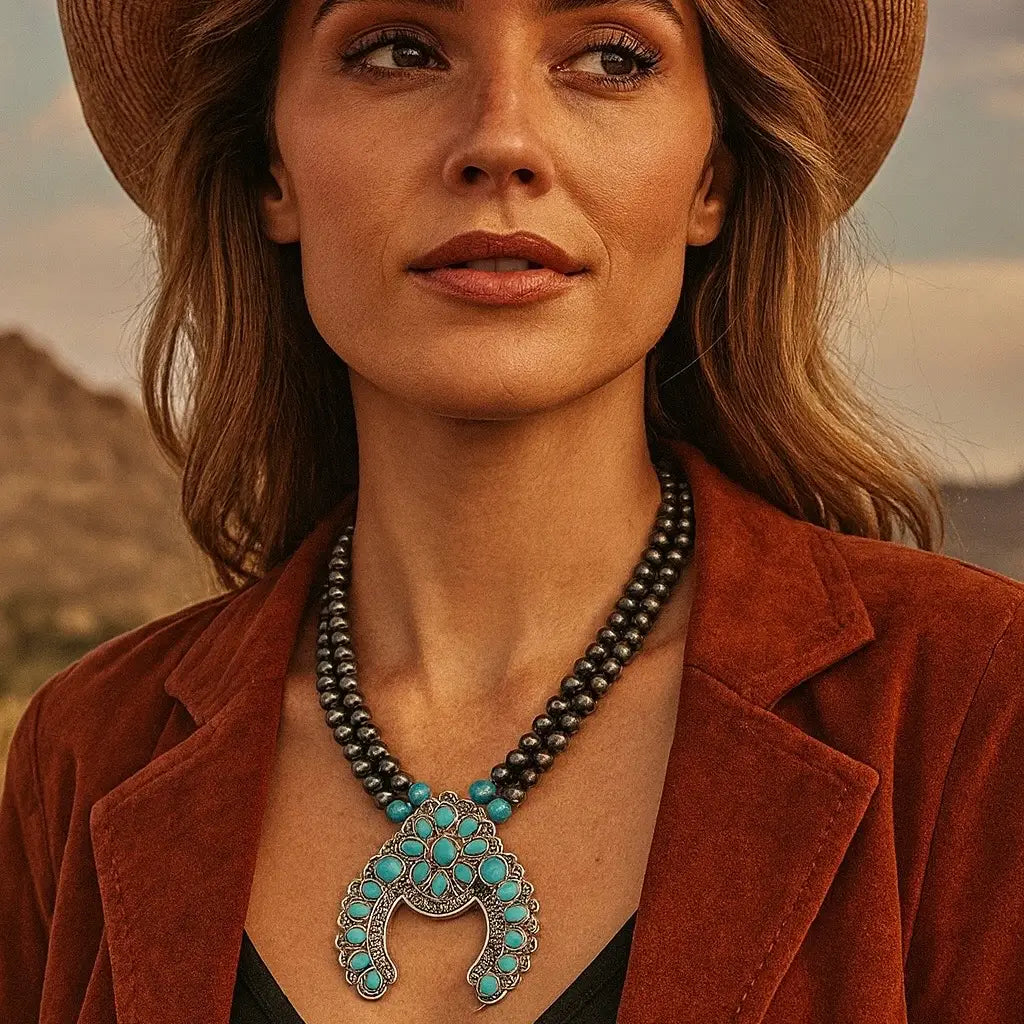 Elevate your Western style with the timeless beauty of this Navajo Inspired Pearl Squash Blossom Necklace. Featuring imitation silver beads, often called “Navajo pearls,” this piece carries an authentic Southwestern spirit without breaking the. At the center, a bold squash blossom pendant adorned with intricate detailing and turquoise accents.