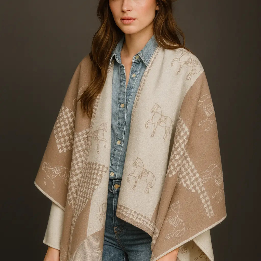 Wrap yourself in timeless equestrian elegance with this winter scarf. Crafted from luxuriously soft fabric, it features a refined houndstooth weave accented with a graceful horse motif throughout. The neutral tones and classic pattern make it versatile enough to pair with denim, wool coats, or tooled leather handbags. The generous size allows for endless styling option from a cozy wrap to a chic neck drape.