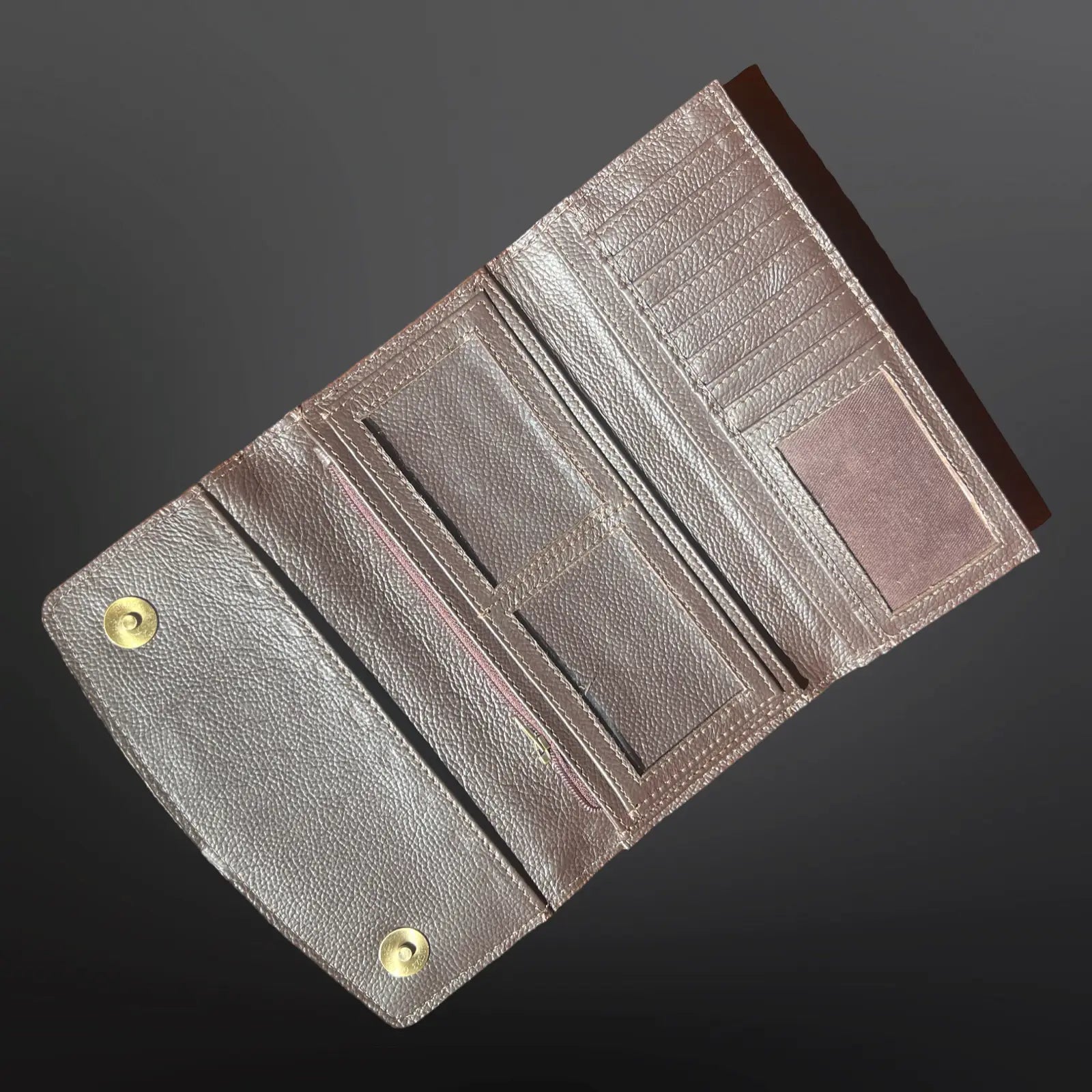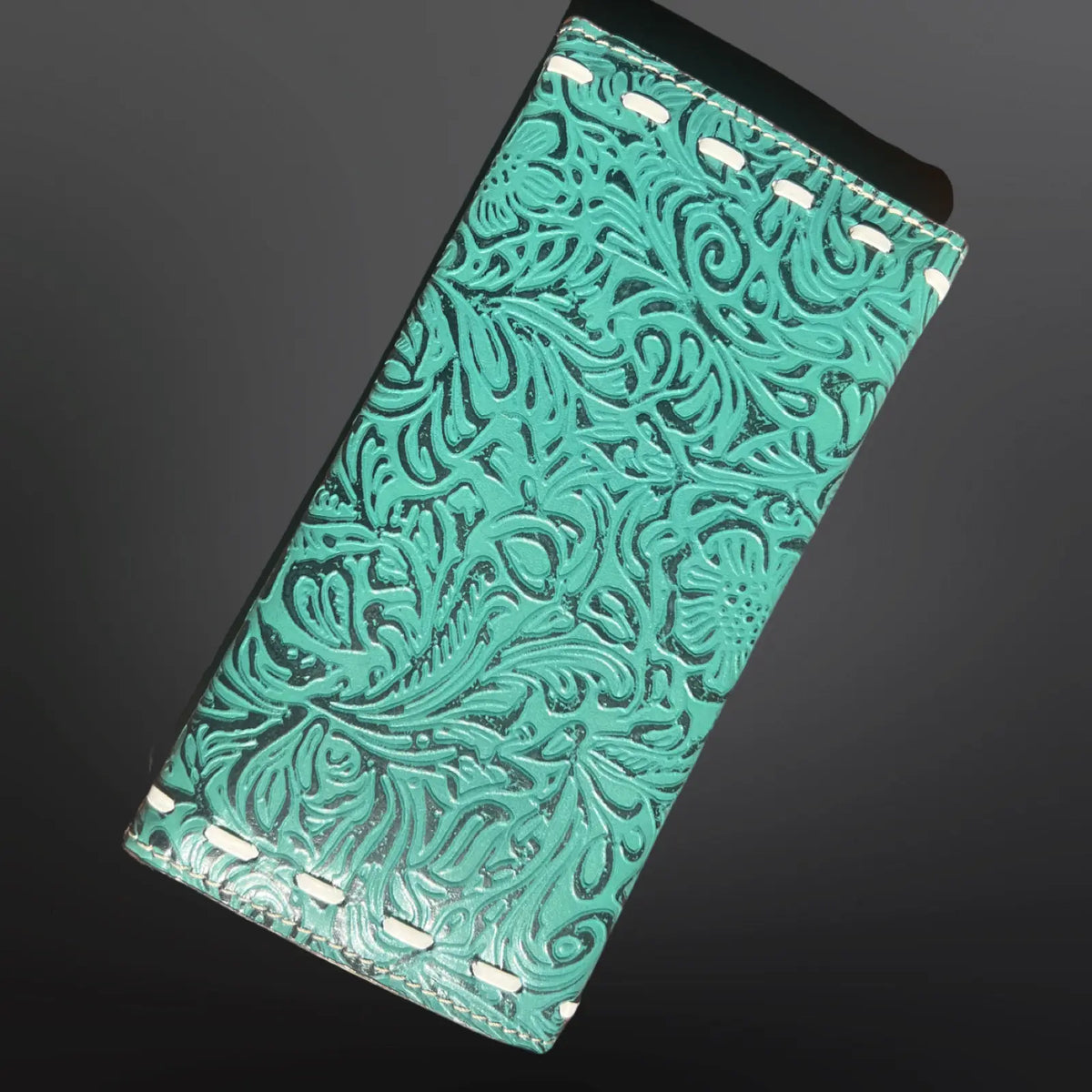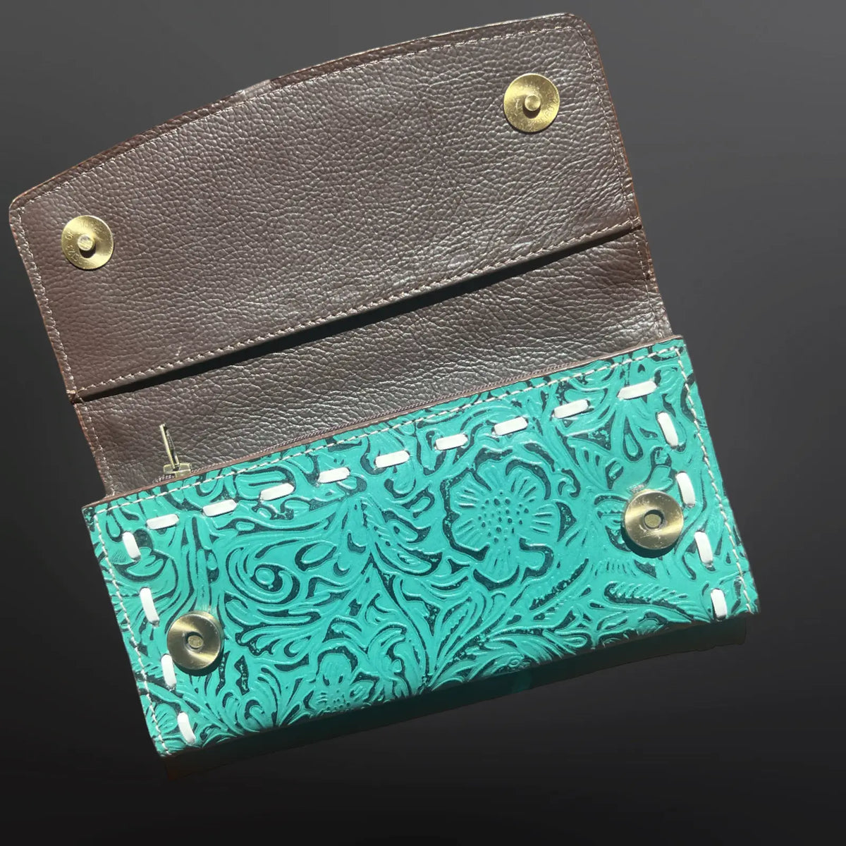 This beautiful wallet features a hand tooled turquoise floral pattern. Genuine hair on cowhide. Full zip closure, internal zippered coin pocket and lots of slots for bills and credit cards. White buck stitching trim.
